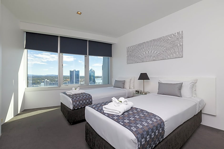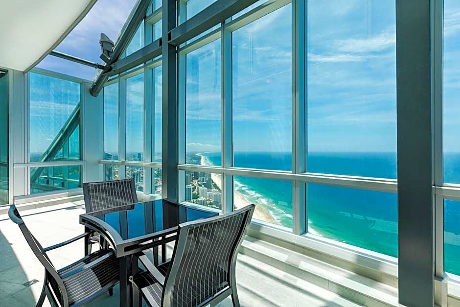 Located from level 70 of the Q1 Resort & Spa, our 4-Bedroom Penthouse Apartments offers 400+ square yards of living space. Featured is a designer kitchen with gas appliances, dishwasher, multiple dining areas and large living spaces. It includes 2 grand master bedrooms both with private private bathrooms, one of which includes a spa bath. Another main bathroom with its own spa bath and an additional separate powder room are also included. Complete laundry facilities with washing machine and dryer are also available. The Penthouse features 2 unique glass enclosed balconies with breathtaking views of the Pacific Ocean, Surfers Paradise, Broadbeach, Gold Coast waterways and Hinterland. This room includes a 25% discount for SkyPoint Climb.
